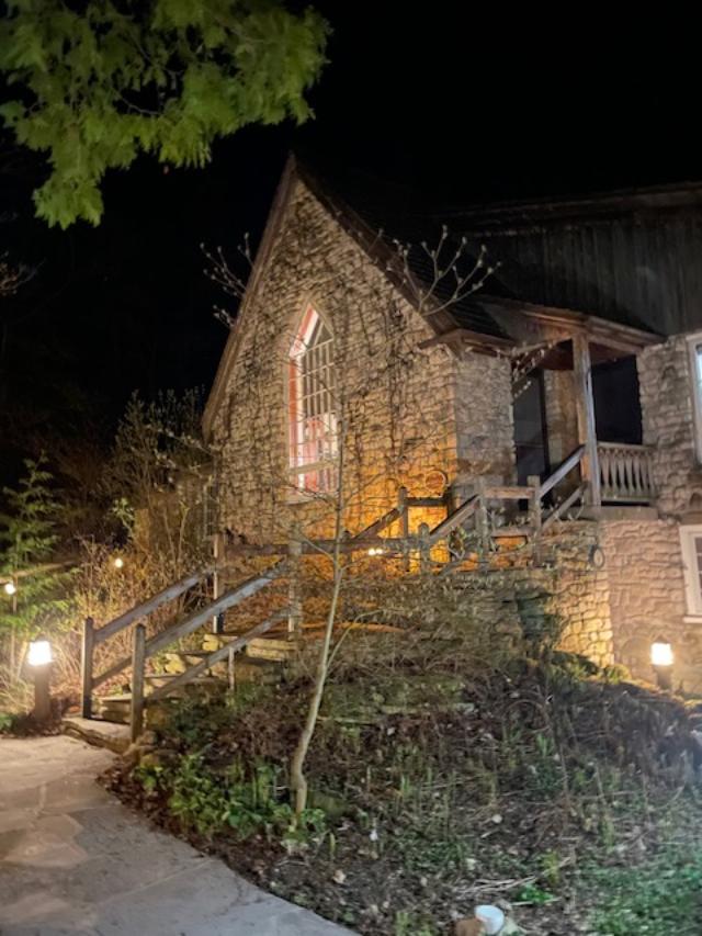 This is a night picture of the Main Lodge. Students and teachers come together here for each meal. To learn more, click here… https://theclearing.org/wp/visit/
