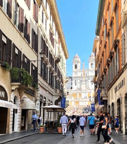 I found this expensive shopping district more fascinating than the crowded, noisy, area around the famous fountain or the picturesque steps where everyone was jostling for the perfect picture-taking opportunity. Like the hidden beauty of the cloistered area behind San’t Isidoro, the silence and calm simplicity of this rich street appealed to me. However, unlike the church where everyone was welcome, these stores only wanted the rich to enter, and to spend large amounts of cash.