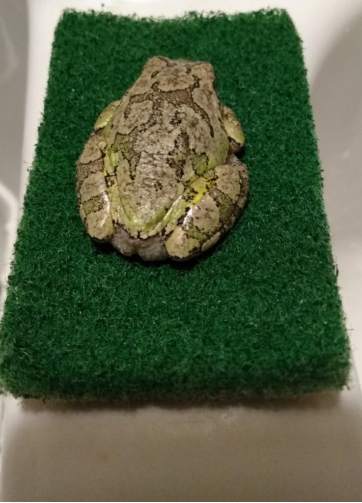 One day as I looked at the pictures she’s taken of the frogs, I guessed, “I think they look like Gray Tree frogs.” Then I teased, “In my book, they classify as new pets! You now have two little froggies and a doggie. Have you picked out names for them yet?”