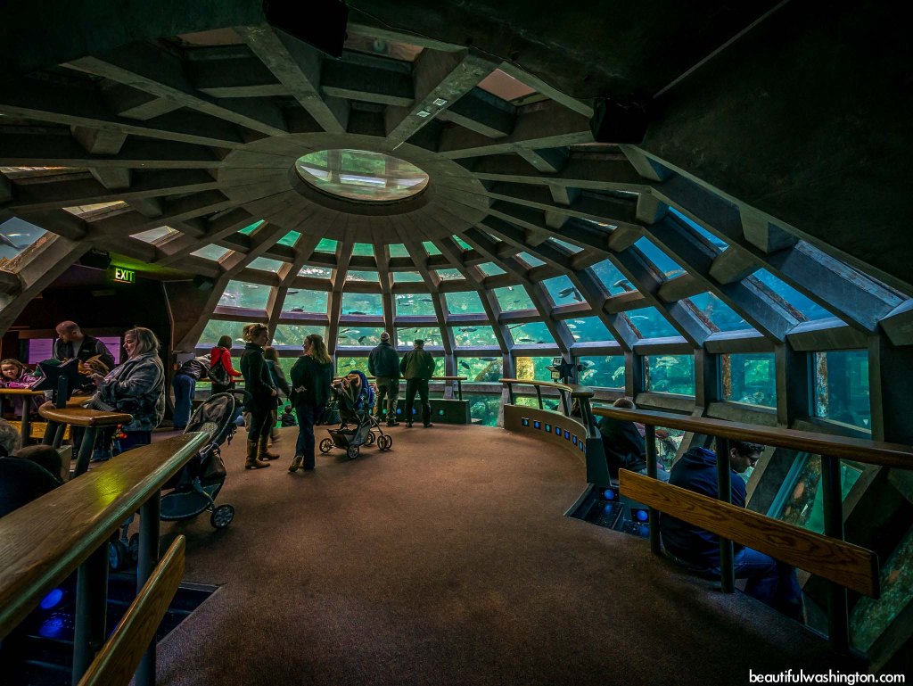 The Seattle Aquarium built a huge addition to their facilities since our first visit, so we were eager to discover what it held. The new building contained a huge 325,000 gallon pool filled with hundreds of different types of fish. I sat on a bench in front of it, and the curved glass containing the water was so large that it was above me, and around all the way to my left and right. I enjoyed watching the amazing stingrays as they swam around. Several smaller fish followed the stingrays like stage door groupies. It took me a while to figure out why they were so attentive to the star. It turned out that the stingrays were eating, and some food was falling out of their mouths. The small fish were feeding on the fallout.