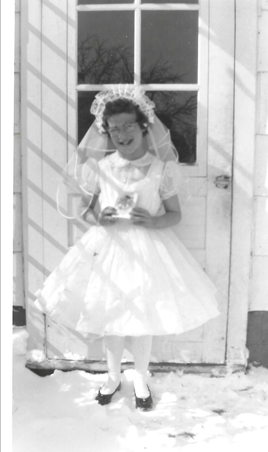 The next morning the sun came out and the air turned warm. The shoveled sidewalk along the house was awash with melting snow. The new, clean snow was so white, and the sun was brighter than my lacy, white First Communion dress. When I stepped out of the house, I was blinded. I couldn’t open my eyes.